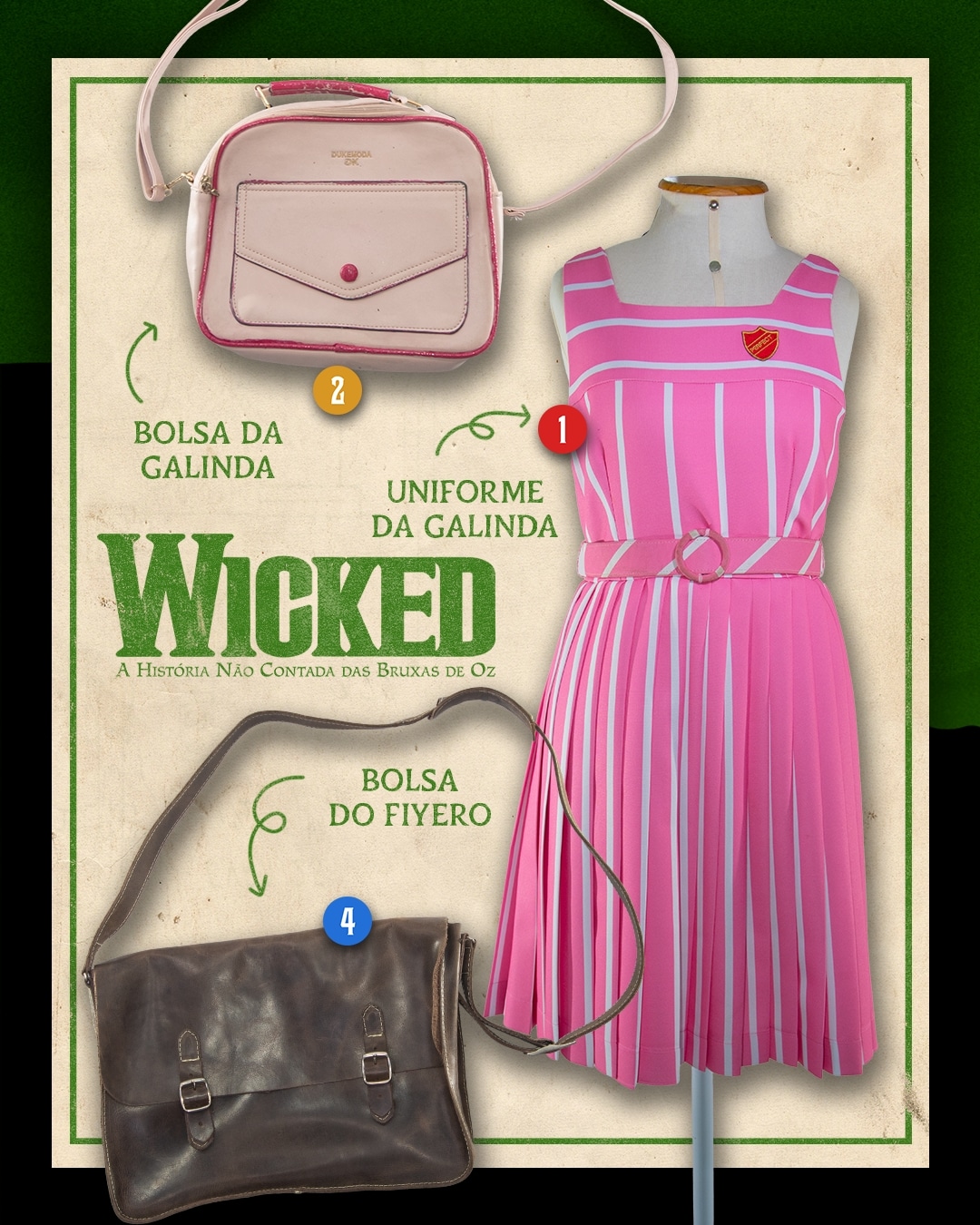 Entre os principais itens do leilão estão vestidos e uma bolsa da personagem Glinda, além da vassoura e vestidos de Elphaba. O público também poderá arrematar figurinos e adereços de musicais como Evita, Legalmente Loira, Escola do Rock, O Homem de La Mancha, Annie, Cantando na Chuva, entre outros.